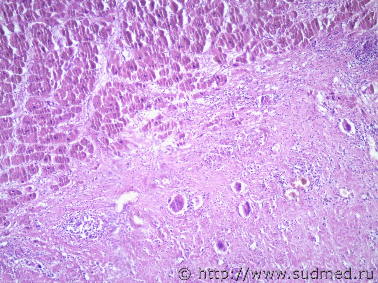 Добрый день. Нужна помощь. Женщ. 60 лет. Макроскопических данных (вес, размер) нет. Микро- выраженный кардиосклероз, с очагами круглоклеточной инфильтрации, крупными многоядерными клетками. В других органах без особенностей.