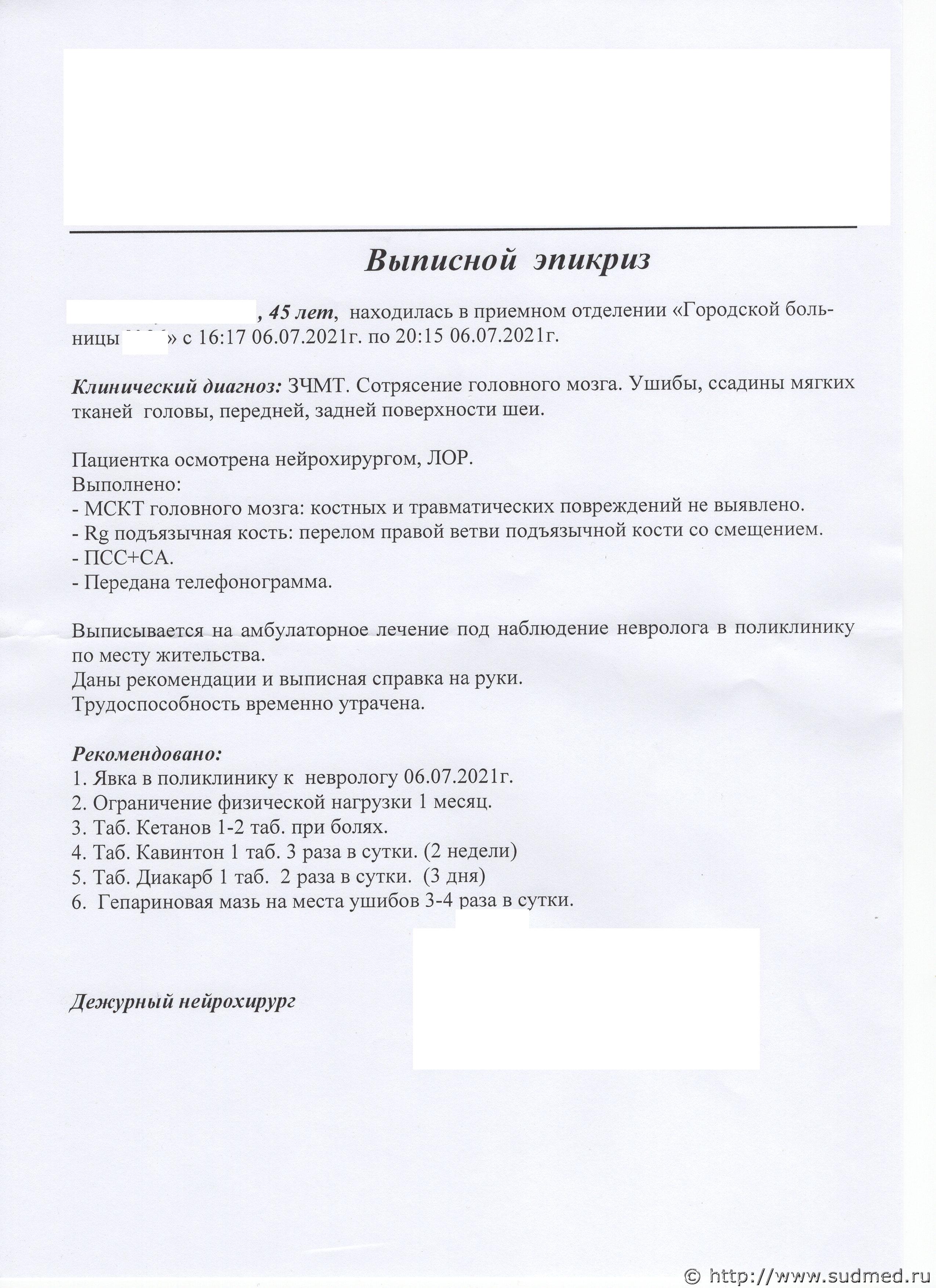 Проконсультируйте меня , пожалуйста! В июле прошлого года на нашей лестничной площадке у меня произошел конфликт с соседом (он живет на том же этаже, ему 82 года). Мы с моей соседкой пытались поговорить с ним на тему его безответственного и жестокого обращения с животными (кошками), свидетелями которого мы стали. Но разговор не задался, сосед стал осыпать нас оскорблениями и угрозами. Я попыталась продолжить разговор по существу, но сосед сказал мне: "Я тебя убью! Я тебя задушу!". При этом он стал наносить мне удары руками и хватать за горло (несколько раз). В конце, схватив меня за горло, он толкнул меня на соседскую дверь, и я ударилась об нее головой. После всего этого я сразу вызвала полицию. Полицейский составил протокол и отправил меня в травмпункт снимать побои. В травмпункте я оказалась около 14 часов, там меня осмотрели, вызвали скорую и на скорой отвезли в больницу, чтобы более детально обследовать. В больнице я была до самого вечера, делали рентген , КТ и т. д. В итоге, я несколько дней провела с полосами на шее, синяками, болела голова, слегка мутило и был хрипловатый голос. К врачам больше не ходила, отлежалась дома. В полиции в тот же день возбудили дело по статье 119 УК РФ "Угроза убийством". Дело тянется до сих пор. Осенью меня вызывали, чтобы ознакомить с результатами проведенной судмедэкспертизы. Там написано, что никакого вреда моему здоровью причинено не было. Скажите, пожалуйста, это нормально? Это правильное заключение? В выписке из больницы указано: закрытая черепно-мозговая травма, сотрясение мозга, перелом ветви подъязычной кости со смещением. Это все, помимо синяков и ссадин, не является вредом для здоровья? Даже легким? Буду очень благодарна за объяснения. Выписку из больницы прилагаю. Эскизы прикрепленных изображений |