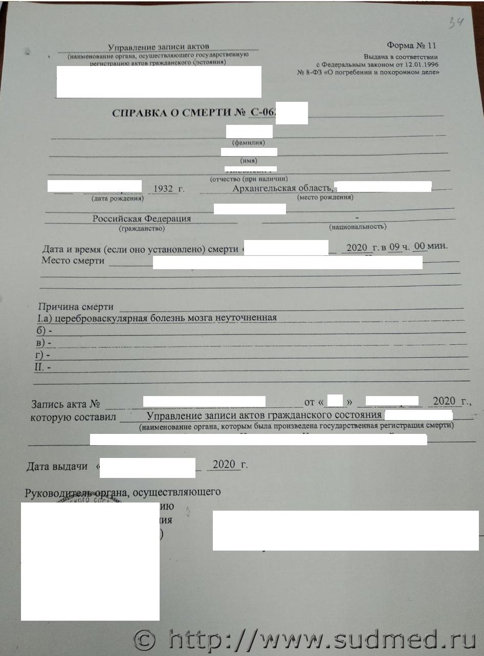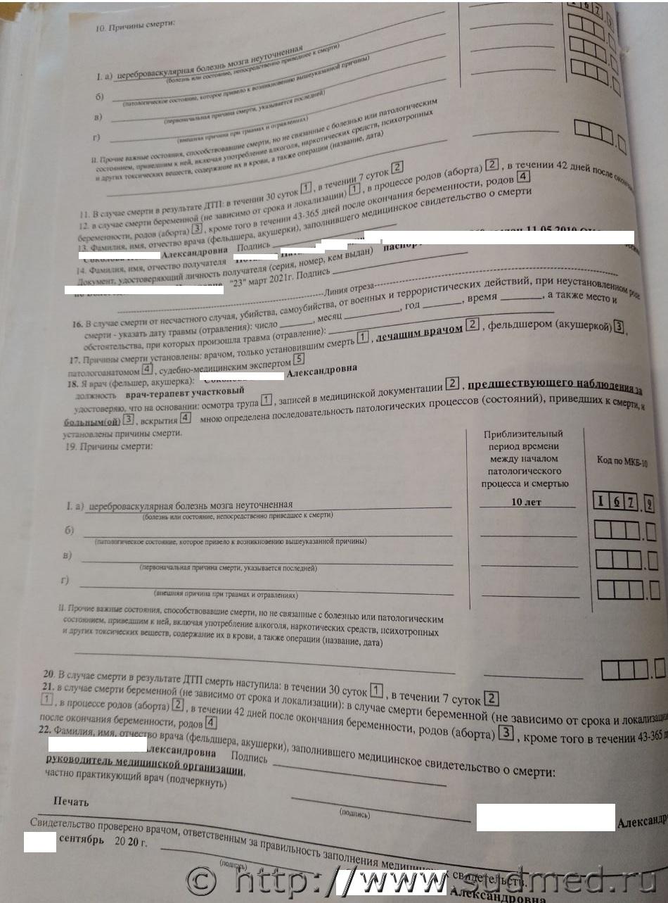 Прошу посмотреть приложенные медицинские документы и подтвердить или развеять мои сомнения. Умер человек у себя в квартире. Родственники пришли к нему якобы через несколько минут после наступления смерти. Они же через 1,5 часа вызвали скорую помощь для констатации смерти. Объяснить почему так долго не вызывали, не могут. От вскрытия родственники отказались в связи с якобы прижизненным волеизьявлением умершего. Заявление об отказе было удовлетворено. Захоронение проведено без вскрытия. Последний осмотр врачом умершего был более, чем за 12 месяцев до дня его смерти. До этого - еще за ~ 2 года. Установленная врачем причина смерти: Цереброваскулярная болезнь мозга неуточненная МКБ i67.9. Читаю документ: ПРАВИЛА ФОРМУЛИРОВКИ ПАТОЛОГОАНАТОМИЧЕСКОГО ДИАГНОЗА, ВЫБОРА И КОДИРОВАНИЯ ПО МКБ-10 ПРИЧИН СМЕРТИ КЛАСС IX. БОЛЕЗНИ СИСТЕМЫ КРОВООБРАЩЕНИЯ Москва 2019 г в документе написано: Особенности формулировки диагноза при цереброваскулярных болезнях [...] Заключительный клинический, патологоанатомический и судебномедицинский диагнозы при ЦВБ (как и при других заболеваниях) должны быть максимально развернутыми. Не используется ни в какой рубрике диагноза групповое понятие «ЦВБ», а также неуточненное понятие «цереброваскулярная болезнь неуточненная» (код I67.9). Читаю еще 1 документ: ПОРЯДОК ОФОРМЛЕНИЯ «МЕДИЦИНСКИХ СВИДЕТЕЛЬСТВ О СМЕРТИ» В СЛУЧАЯХ СМЕРТИ ОТ НЕКОТОРЫХ БОЛЕЗНЕЙ СИСТЕМЫ КРОВООБРАЩЕНИЯ Методические рекомендации г. Москва, 2013 год В нем примерно то же самое, что и в первом: 5.6. Хронические формы цереброваскулярных болезней (I67). Хронические формы цереброваскулярных болезней могут являться первоначальной причиной смерти только в случаях присоединения тяжелых осложнений, как, например, пневмонии. Такая логическая последовательность должна быть обязательно указана в медицинском свидетельстве о смерти. Не допускается запись хронической формы цереброваскулярных болезней одной строкой без указания логической последовательности. [...] Во всех случаях, когда диагноз уточнить невозможно, и причина смерти сомнительна или неизвестна, необходимо проведение патологоанатомического вскрытия. Как соотнести эти документы (МСС и то, что я процитировал из двух методичек) ? МСС составлена с нарушениями ? Заявление об отказе от вскрытия удовлетворено незаконно поскольку причина смерти фактически не установллена ? PS. И вот только сейчас, загружая сканы документов, обнаружил в МСС, составленной в сентябре 2020 г. странную дату из будущего - 23 марта 2021 г... Примерно в эту дату копии медицинских документов запрашивала полиция в рамках проведения проверки. Копия МСС почему-то без печатей и подписей. Эскизы прикрепленных изображений |
