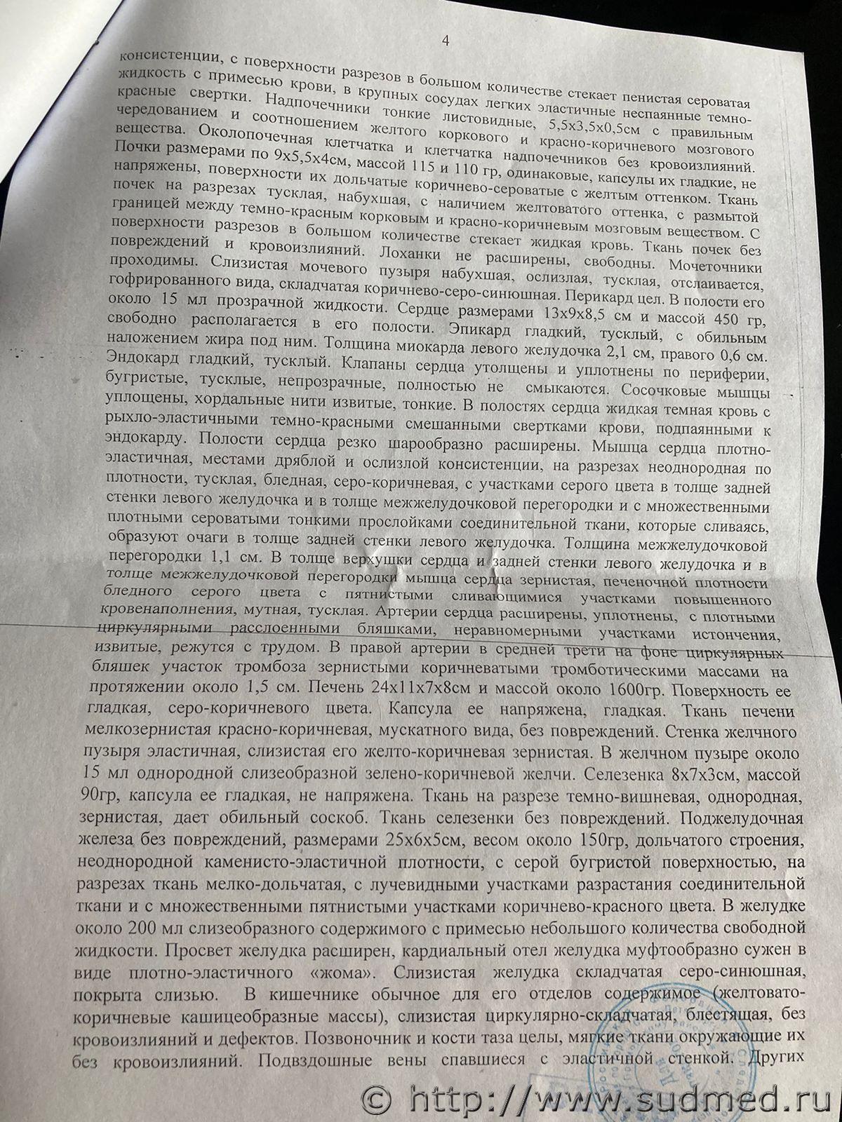 Папа умер 8 марта, во сколько именно, неизвестно, приблизительно между 16 и 21 часом. Скорую сестра вызвала в час ночи, так как папа не выходил из комнаты долго и когда она зашла его проверить, он уже был холодный. В скорой фельдшер сказал, что смерть наступила 4-5 часов назад и что смерть была внезапной. На сердце папа не жаловался , но были факторы риска ссо 3. Это я прочла в его выписке из больницы, где в 2020 году ему удаляли раковую опухоль пищевода. Точнее был удален пищевод и из желудка сформирован новый. Папа больше 40 лет купил и 30 лет злоупотреблял алкоголем, пил водку. Даже после успешной операции и лучевой терапии, через 5 месяцев запил снова. Никаких жалоб в день смерти не высказывал, чувствовал себя нормально, занимался обычными делами. Это все известно , потому что папа жил с семьей моей сестры, в тот день со всеми общался. На момент смерти примерно 2,5 недели не пил, такое иногда бывало, что мог не пить по 2 недели после длительного запоя. Извините, что много написала. Вопросы в следующем: 1.можно ли по протоколу вскрытия сказать, что смерть наступила внезапно, в один момент? Папа лежал, смотрел телевизор, как врач скорой сказал, что исходя из его опыта, папа сам не понял, что умер, судя по позе. 2. Причина смерти острая сердечная недостаточность- это то же самое, что внезапная сердечная смерть? И можно ли по заключению сказать, что говоря простым языком, оторвался тромб? 3. Могла ли грыжа пищеводного отверстия диафрагмы способствовать смерти? 4. Могло ли повлиять то, что папа лежал? Может ли быть так, что если бы он стоял или сидел, это смерть наступила бы позже? 5. О чем говорит жидкость в плевральных полостях и в области перикарда? 6. Насколько я поняла, с сердцем все было очень плохо, почему же папу это не беспокоило? Читала, что при сердечной недостаточности за какое то время до наступления смерти случаются головокружения, обмороки , отдышка. У папы этого не было. Прилагаю акт суд - мед экспертизы. С уважением, Екатерина. Эскизы прикрепленных изображений |