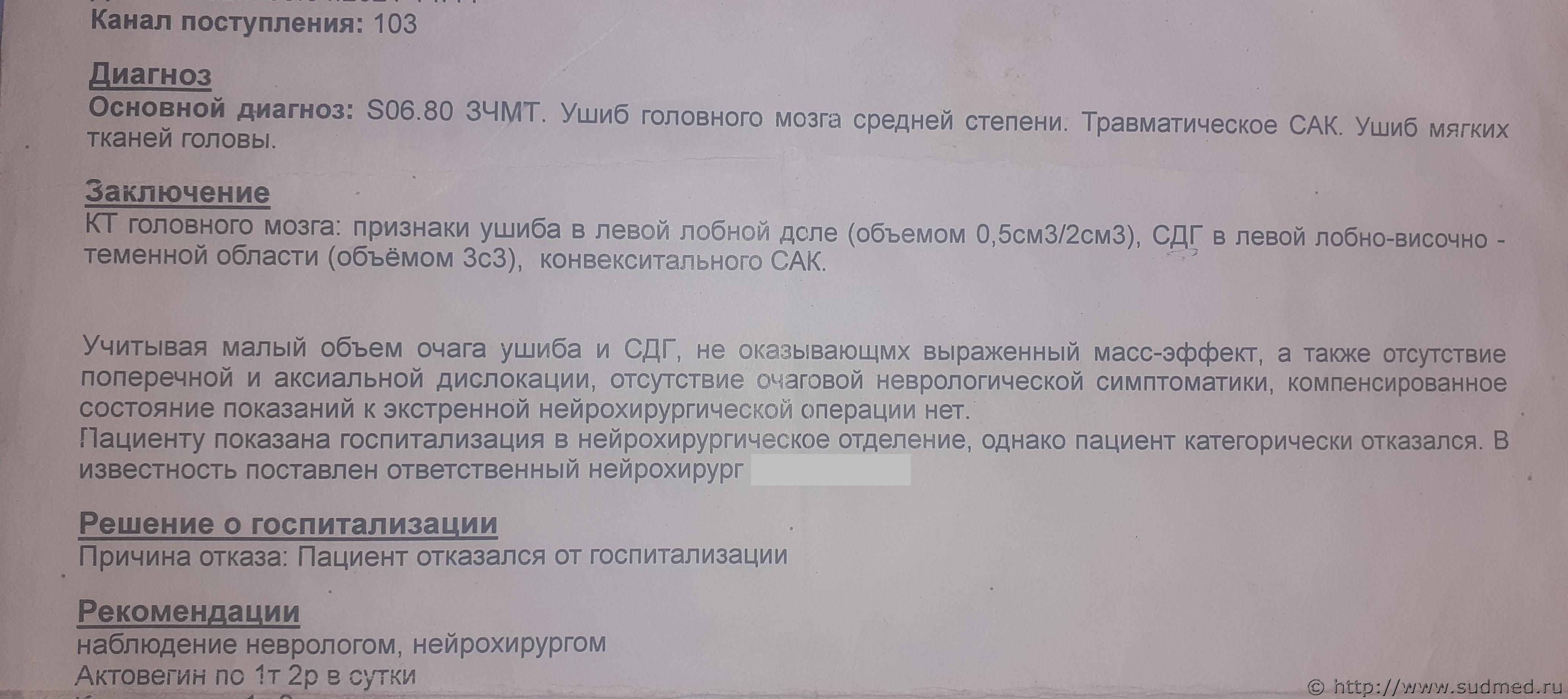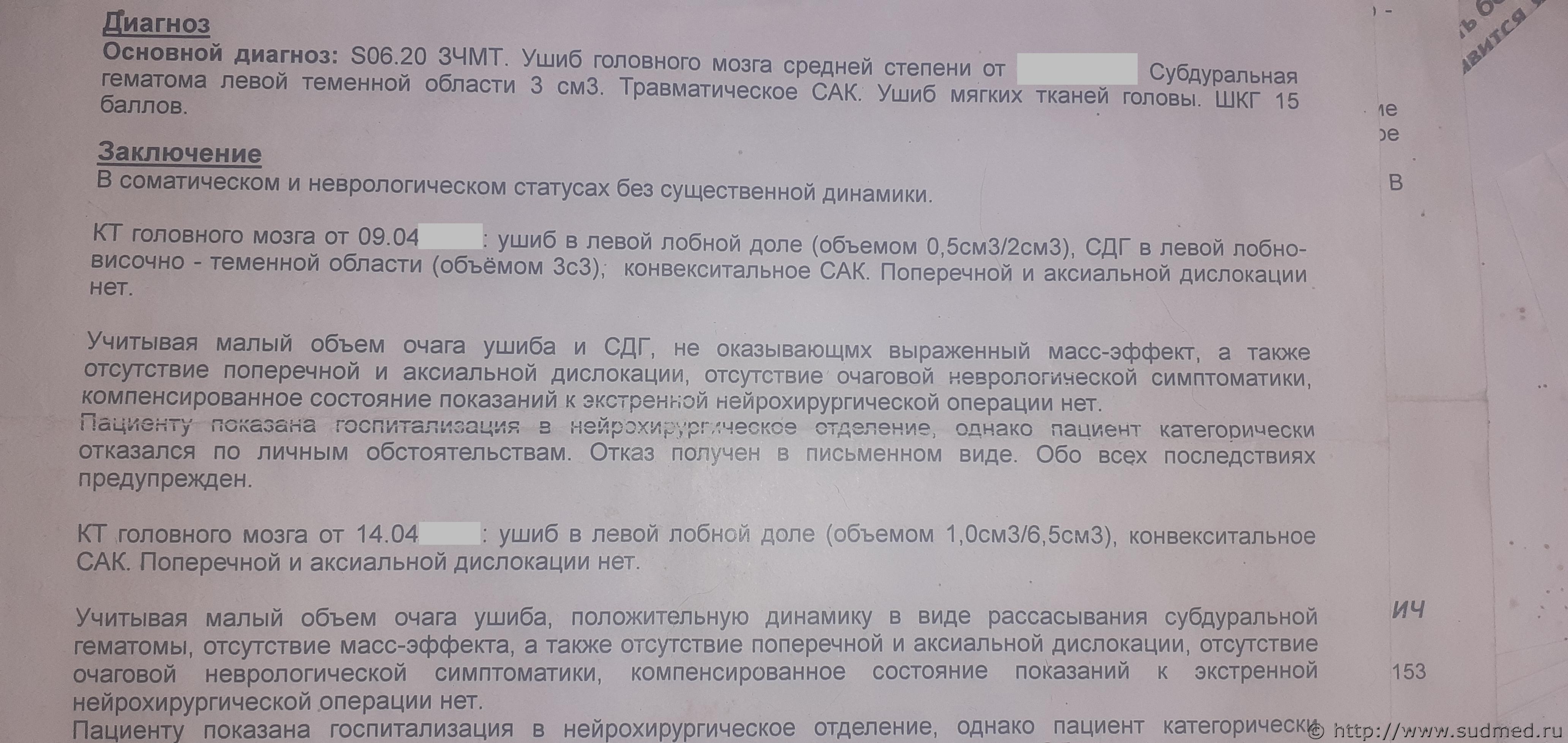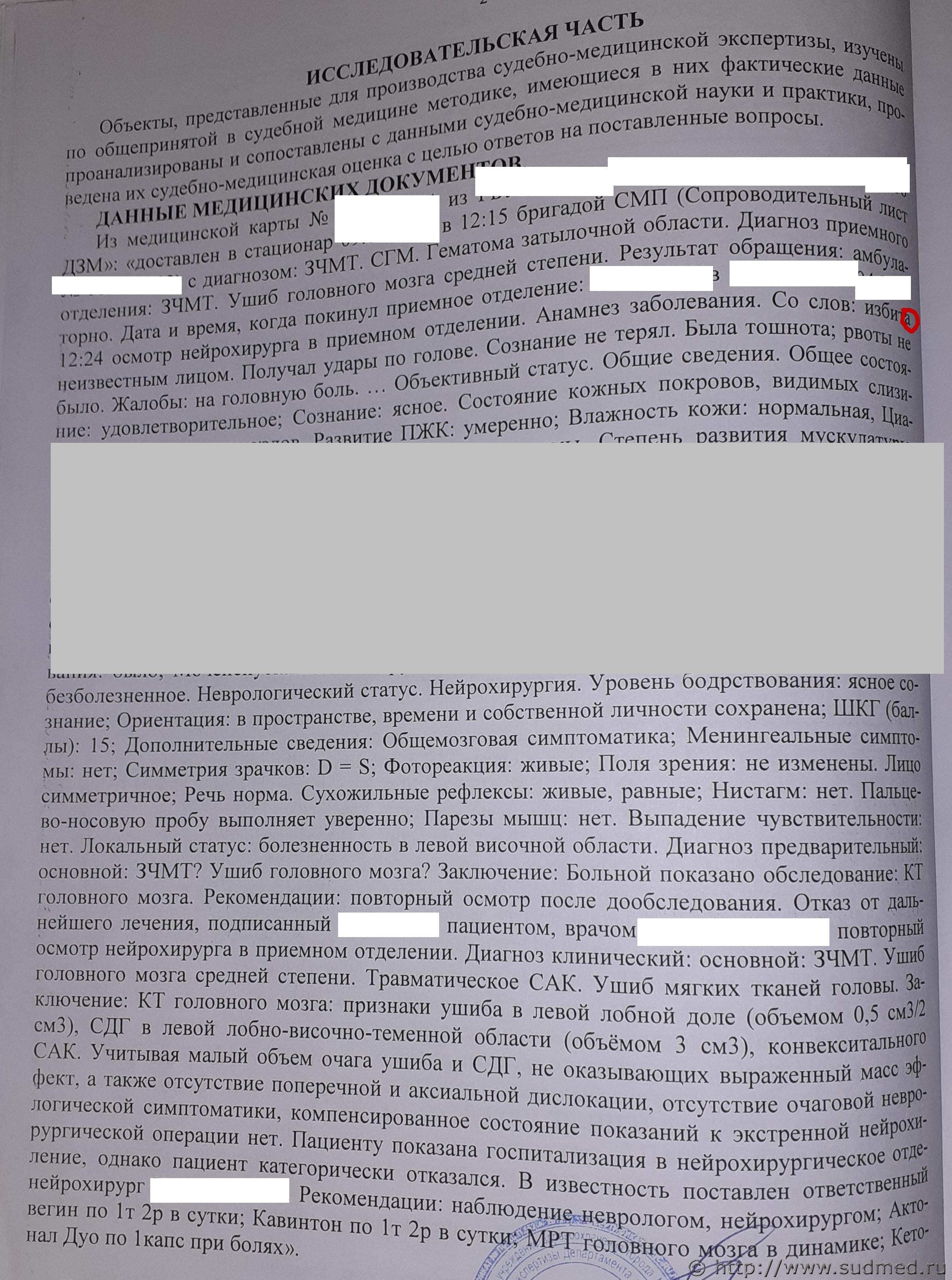 Было нанесено около 9 хлестких ударов по вискам. Один средней силы, после чего я потерял сознание. Три месяца лежал, первый месяц пластом. В полиции отказались заводить дело. ЗЧМТ, САК, потеряно зрение на правый глаз, не могу читать, двоится-троится изображение, аккомодация правого глаза замедлена, нарушена, четко видно только в очках, и только на определенном расстоянии.Последние четыре-пять месяцев стала неметь кисть правой руки. |