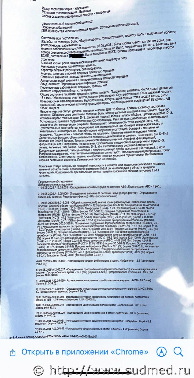 Я так понимаю что участковый вообще направил только выписку с диагнозом с первого стационара где она лежала 6 дней, потому что со второго она только недавно вышла. Экспертиза судебно-медицинская по выпискам и справкам не проводится, т.к. эти документы не содержат исчерпывающих данных. И вот еще вопрос. Получается по СГМ она лежала в первой больнице 6 дней всего, потом у нее была неделя больничного , она дома была и потом легла уже с якобы последствиями СГМ с теми же симптомами как головокружение, боль в голове, замедленная речь итд и там ставят ей Церебрастению, посттравматическое расстройство речи,церебральную ангиостонию. Но это ведь вообще может быть даже и не связано с СГМ даже если его подтвердят, получается эти дни тоже плюсуют врачи просто с ее слов что это последствия? Последствия СГМ должны быть объективно подтверждены и оцениваются по таблице процентов утраты общей трудоспособности в результате различных травм, отравлений и других последствий воздействия внешних причин. Согласно этой таблице пункт 4 все равно предполагает легкий вред. Да конечно экспертизу нам все равно ждать, просто переживаем немного так как делается она долго И еще вот хотела прокомментировать что очень жалко конечно когда врачи ставят диагноз без разбирательств. Одно дело когда это простой больничный и человек косит от работы а другое когда это умышленная симуляция чтоб вписать человеку уголовку и ограничить его в общении с ребенком. Люди же больные бывают и психически в том числе и начинают творить эту жесть, а люди ни в чем не виновные страдают потому что врачам не хочется разбираться Задачи у клиницистов (неврологов, нейрохирургов) совсем не те, что у морфологов (судебно-медицинских экспертов), их цель вылечить, не дать болезни прогрессировать, не дать пациенту умереть, остальное их не интересует... О проблеме гипер и гипо диагностики данной патологии написано много книг СМЭ-ми. не получилось нормально и правильно выделить и ответить, но вчитавшись думаю все станет ясно Да все отлично написано, все понятно👍 Резюмируя для особо занудных 😂 По идее по моим « кривым» документам СГМ не усматривается и если судмедэксперт по нормальным документам его не увидит то получается его как бы и не было и вреда тоже и судить не за что, получается все ее эти диагнозы и лежание в больничках в помойку?. Если все же судмедэксперт установит что СГМ было и при необходимости повторная экспертиза тоже, то вероятнее всего это будет легкий вред здоровью несмотря на количество больничных дней и это уже судопроизводство частного обвинения. |