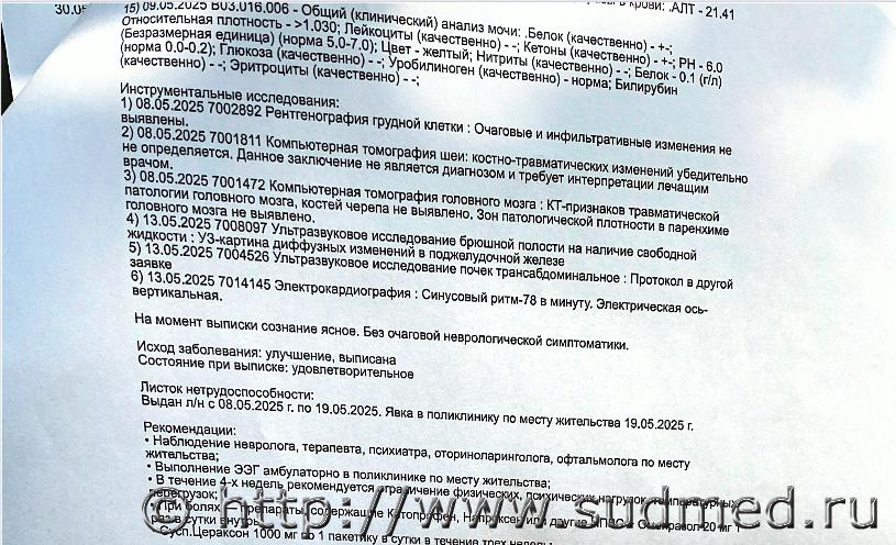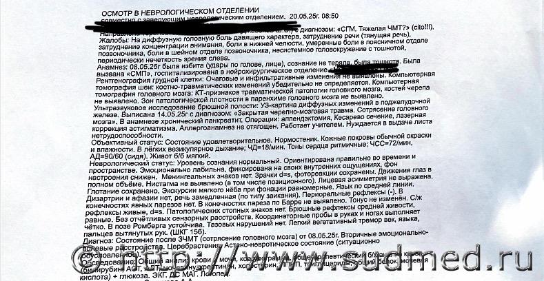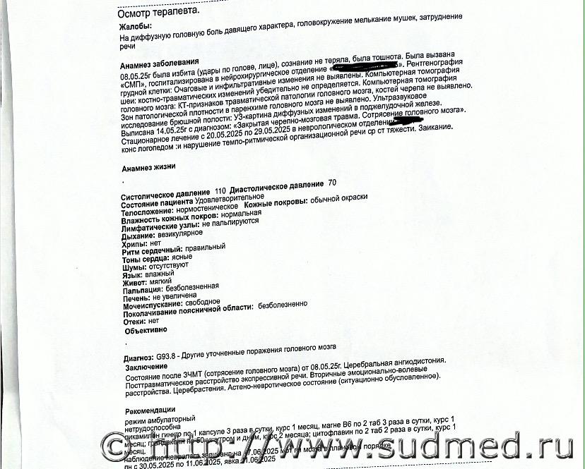 Добрый день! Прилагаю документы от врачей. Был конфликт 08.05 между бывшими супругами. Девушка не в первый раз пытается « засадить» бывшего. Он ее не бил, есть доказательства в виде диктофона и частично видео, но она вызвала после скорую и была направлена в больницу где пролежала 6 дней и выписана с диагнозом сотрясения, далее она не успокоилась и пошла к терапевту и далее в неврологическое отделение легла в стационар, пролежала там до 28 и сейчас опять на больничном и теперь ей назначено МРТ. Участковый говорит направит на суд мед экспертизу и будет по заключению собирать материалы на уголовку, но парень не бил, неужели так просто можно попасть с этой симуляцией. В итоге она лежит уже более 21 дня и куда дальше пойдет ложится с какими последствиями неизвестно.Посмотрите пожалуйста документы, что скажете? Какое бы вы дали заключение как судмед эксперт и если подтвердят готрясение нужно ли подавать ходатайство на повтор или делать независимую. Понимаю что нужно дождаться заключения но говорят его месяцами ждут, а у нас вся семья переживает. Дневник наблюдения в стационаре каждый день одинаковый переписан, прилагаю только один лист