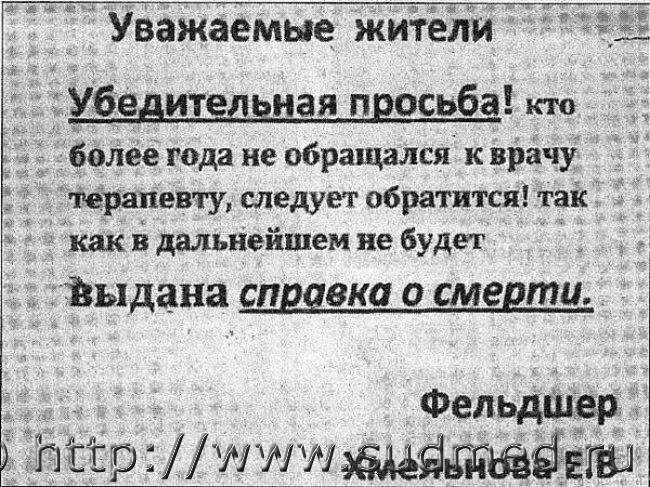 "Теперь я понимаю и что это была за трын-трава на поляне, и что это были за зайцы, и почему им было все равно, и зачем они ее с таким упорством косили... а главное, почему - именно ночью." И еще, "из обще-медицинского": - Больной, вам прописаны свечи. Приготовьте, пожалуйста, ваш канделябр... "Акушерско-неонатологический": Новоиспечённый отец рассказывает другу: - Жена родила! Причём рожала по-модному - в воде. Ребёнок просто замечательный: 4 килограмма, и на редкость неприхотливый - его только корми, да в аквариуме воду меняй почаще... |