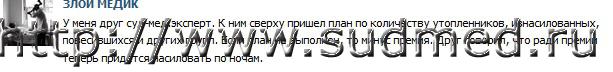 хочу не мёртвых а живых сказал патологоанатом и посмотрел на главврача проела плешь прогрызла печень сейчас в кишках копаю ход ищу я так к мужскому сердцу подход она так быстро мне открыла что я нечаянно проткнул ей глаз вот этим самым пальцем которым целился в звонок Зухра, выщипывая брови Задела очень важный нерв Теперь, когда она моргает То поднимается нога смешались в кучу кони люди дракон и десять мух цэцэ а это точно бэ двенадцать в шприце последний раз на порносайте илья рассматривал сексбомб и сам по полной оторвался и тромб... |