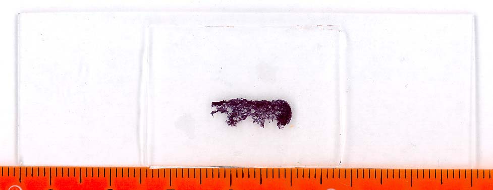 Это не соскоб, а срез. Мы иногда этой "двойной бритвой" пользуемся. Получаются для микроскопа достаточно толстые срезы. Идея заключается в том, что в толстом срезе видны стенки альвеол и не разрезанные сосуды, которые хорошо просвечиваются. Метод очень прост и быстр. Правда красит у нас всё лаборант-гистолог и накрывает препарат предметным стеклом. Обычно после вскрытия сразу суём стекло под микроском и ждём чуда, т.е. "красных червяков". Так выглядят заполненные жиром мелкие легочные артерии.