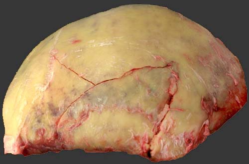 В рамках основной темы предлагаю всем начинающим судмедэкспертам ситуационную задачку №2 из моего сегодняшнего случая со вскрытии. Акт ещё не закончен, так что прошу выссказываться по случаю. Обстоятельства: Пожилой мужчина находясь судя по описаниям двух свидетелей (оба тоже пьяные) в сильной стадии алкогольного опьянения шёл неуверенно, сильно покачиваясь и толкая рядом с собой велосипед, т.к. ехать на нём похоже не мог. Был потерян свидетелями из вида. Шёл к ж/д путям. При попытке пересечь ж/д пути попадает под товарняк, который двигается со скоростью 20-25 км/ч. Машинист тепловоза говорит, что солнце стояло так низко, что он из-за ослепления только непосредственно перед столкновением велосипед заметил. Пострадавшего вообще не видел. Экстренно затормозил, тут же вызвал "органы", те сразу "скорую". Пострадавшего обнаружили рядом с путями в кустах, в 1-2 метрах от рельса. Велосипед покарёжен и лежит на полотне. Голова потерпевшего лежала якобы на бетонном камне или блоке, который лежал в кустах. Минут через 10 приехал врач скорой помощи, потерпевшего вытащили из кустов, он был ужё мертв. На вскрытии (примерно 12 часов после обнаружения): Одежда вся разрезана и запачкана кровью. Труп полностью раздет. Трупное окоченение резко выражено. Трупные пятна на задней поверхности, скудные. Признаков гниения нет. Повреждений на теле за исключением головы вообще никаких нет. В левой височной области с переходом на теменную ушибленная рана длиной 5 см с частичным рассечением ушной раковины. В глубине пальпируются кости. В области правой надбровной дуги несколько поверхностных свежих царапин. Внутреннее исследование: Туловище, шея, конечности абсолютно чистые, без единого повреждения! Черепно-мозговая травма (см. фото). От линейного максимум на 0,3 см вдавленного перелома на границе чешуи левой височной кости (в задней трети, идёт сверху-вниз, сзади-наперёд), который соответствовал ране на коже, отходят трещины и на основание черепа, где видны пероломы левой, правой основной кости и турецкого седла. Твёрдая мозговая оболочка без разрывов. Субдурально крови практически нет. Субарахноидально минимальные кровоизлияния (см. фото) в области удара и противоудара. Признаков сдавления, отёка гол. мозга нет. Ушибов не видно. Единственно, что обращает на себя внимание это смесь крови с ликвором в боковых желудочках, но не очень много. Эскизы прикрепленных изображений |
