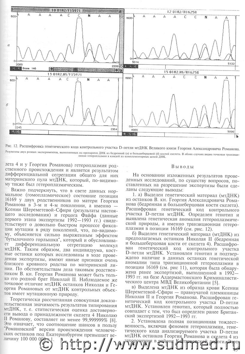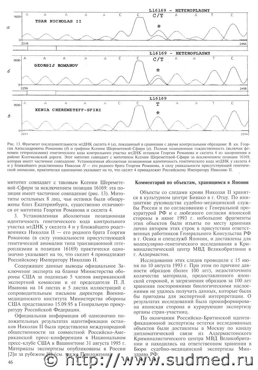 результаты ивановской экспертизы либо былы подтасованы в виду отсутствия пригодной для анализа ДНК-матрицы, либо были получены генетические профили чужеродной ДНК (возможно родственников), загрязнившей имеющийся костный материал (вот Вам одно из объяснений происхождения гетероплазмии у "царя"). Очень уж смущает длительная (десятки лет!) сохранность ДНК в кислой среде. царицын профиль загрязнением получить нельзя, такой и на ее родине днем с огнем не сыскать - разве что если загрязнял сам герцог Единбургский |