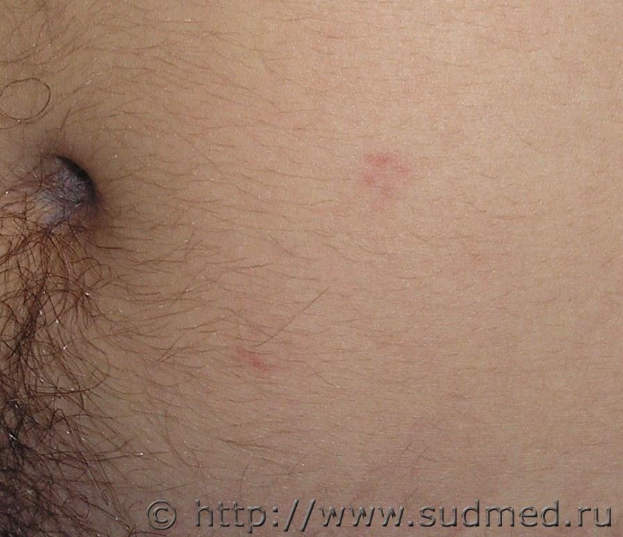 На передней поверхности живота в 14 см от реберной дуги слева и в 6 см от срединной линии на участке 1 см в диаметре имеются четыре точечных ссадины расположенные квадратом в 0,5 см друг от друга, под красно-коричневого оттенка корочкой расположенной выше уровня неповрежденной кожи на фоне гиперемии кожных покровов; на передней поверхности живота слева в 4 см книзу от группы вышеописанных ссадин и в 3 см от срединной линии имеются четыре ссадины выше описанных свойств.