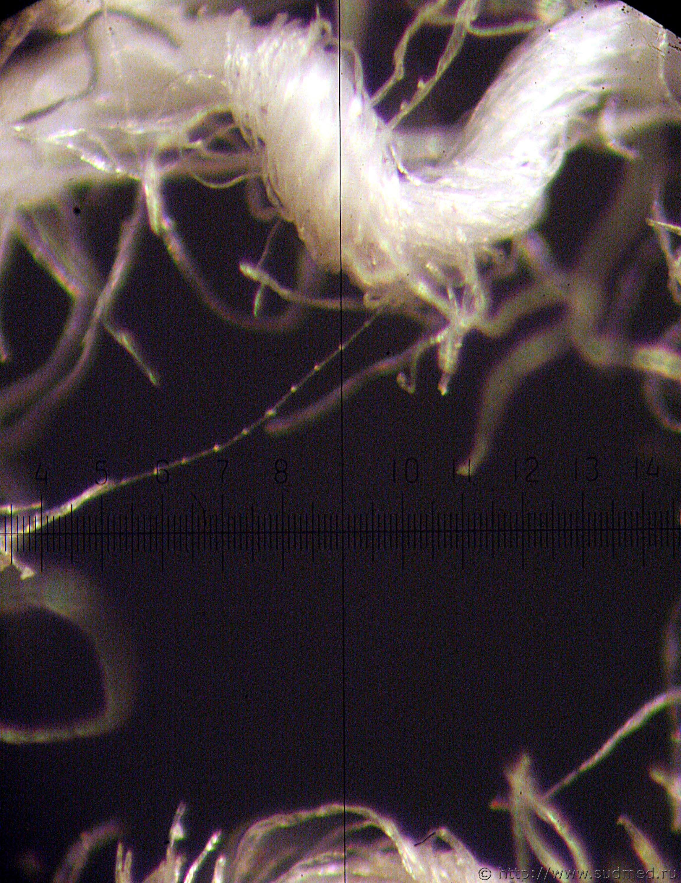 Обращает внимание, что часть "меток" расположена парами. А в просвете некоторых повреждений удалось увидеть вот такие "четки" Даже такого исследования повреждений на одежде достаточно, чтобы говорить о том, что есть признаки сочетанного механического, теплового и электролитического действия |