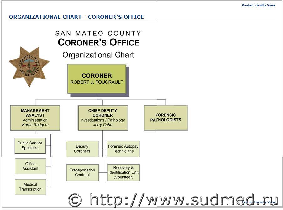 Уважаемый Доктор Немо. Не могли бы Вы объяснить, какое отношение коронерская служба имеет к судебной медицине? Я то же так считал очень долгое время. Но потом я понял, что несколько заблуждался. В разных странах по разному. Где-то (например в Гонкоге) все так, как Вы написали. Но может быть и несколько иначе. В США, например, очень много зависит от местного законадательсва каждого штата. Во многих штатах в США в службе коронеров работают различные специалисты, в том числе и врачи. Часто в США коронер является судебно-медицинским экспертом (в таком случае его называет medical examiner, МЕ), который должен иметь медицинское образование, и чаще всего это специалист в области патологии или судебной медицины . Врачи-коронеры производят как осмотр места происшествия, так и вскрытия, а так же и некоторые другие виды судебно-медицинские исследования - например, судебно-химическое. Что, кстати, они и зачастую отражают на своих эмблемах и символах. Объем дополнительных исследований зависит от величины графства (county) в котором они работают. В этом они подобны нам. Чем больше округ - тем больше видов исследований проводится в коронерском офиссе. Например, в Лос Анжелесе коронеры оснащены получше чем наши коллеги из РЦСМЭ. Отрасль медицины у них называется так же как и у нас - судебная медицина, а вот предстввители профессии - в основном коронеры. Судебными медиками себя там называют в основном либо преподаватели кафедр либо специалисты крупных исследовательских центров. Хотя они предпочитают называть себя судебными патологами (forensic pathologysts) либо медицинскими исследователями (medical examiner). Нередко врачи-коронеры используют расширения судебный патолог (forensic pathologyst) либо медицинский исследователь (medical examiner) как для уточнения своей специализации в коронерской службе. В структуре офиса коронеров очень часто есть говоря по нашему, судебно-медицинский морг (autopsy room). Так что судебные медики (если они не работают в федеральном учреждении) будут носить те же знаки, что и все коронеры. Единственное, что у коронеров, которые не являются врачами и не занимаются осмотром трупов и вскрытиями, а выполняют другие (по сути полицейские) функции, будут поясняющие надписи на шевронах и т.п. Для иллюстрации привожу типичную схему организации небольшого коронерского офиса (наш аналог - районое отделение). Там достаточно все понятно, хотя и по английски В Канаде расследование насильственных смертей либо при подозрении на насильственную смерть проводят либо судебно-медицинский эксперт либо коронер. Поэтому, в ряде канадских провинций - Альберта , Манитоба , Онтарио , Новая Шотландия , Ньюфаундленд и Лабрадор и Остров Принца Эдуарда , все коронеры, согласно закону, врачи, имеющие специализацию по судебной медицине . Они же проводят и вскрытия А тесты обязательно переведу. Нет проблем. С уважением, Доктор Немо ![]() |