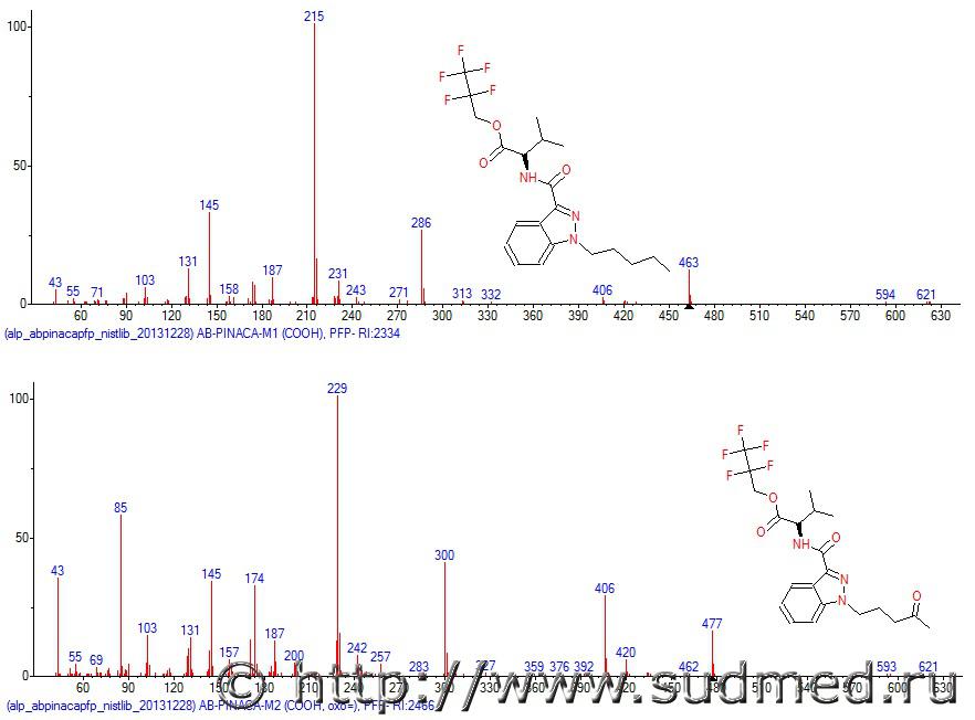 Спектрики под АМДИС. 5F-AMB он же может выступать как метилированный маркер FAB-144. При анализе мочи, после метилирования мы получаем исходный 5F-AMB... ![]() И ещё новиночка SDB-006. Индексы корректны для 5F-AMB (он же метилированный маркер FAB144 / 5F-AMB) и SDB-006. Прикрепленные файлы ![]() |