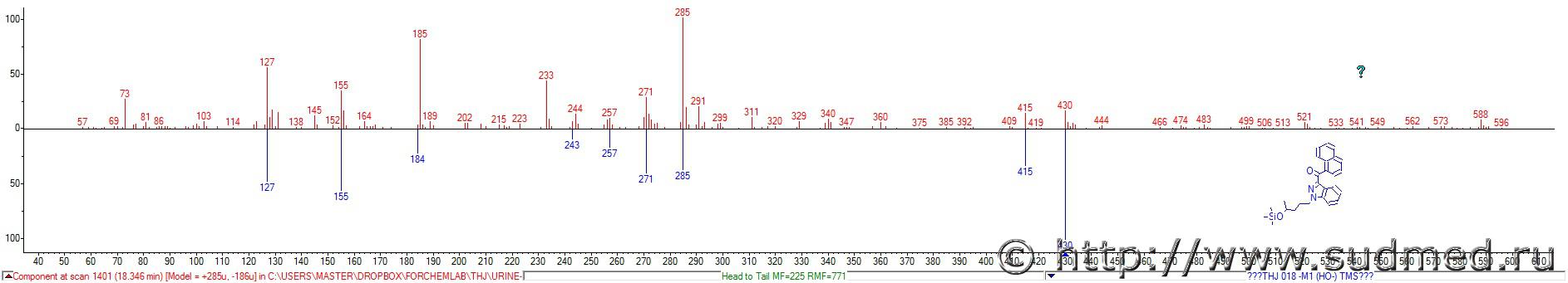 На выходных попалось 2 кролика с индазольным аналогом АМ-2201. во вложении хроматограмма и 3 метаболита. пока полностью аналогичны тем что были найдены для АМ-2201. В качестве критерия поиска по прежнему вторичная фрагментация общих (с нативным веществом) ионов Если кто найдет на хр-ме иные метаболиты, сообщие будем их рассматривать под микроскопом (мс-мс). завтра поспеют опарыши, посмотрим чего у них напреет! ВОТ СПАСИБО, КОЛЛЕГА! Ваша хроматограмма неплохо совпала с ранее сконструированными спектрами! 5-карбокси, ![]() и, видимо, 5-гидрокси(в данном случае он идентифицирован как 4-гидрокси THJ018): ![]() Завтра все отшлифуем - и в сводную! Прикрепленные файлы ![]() |