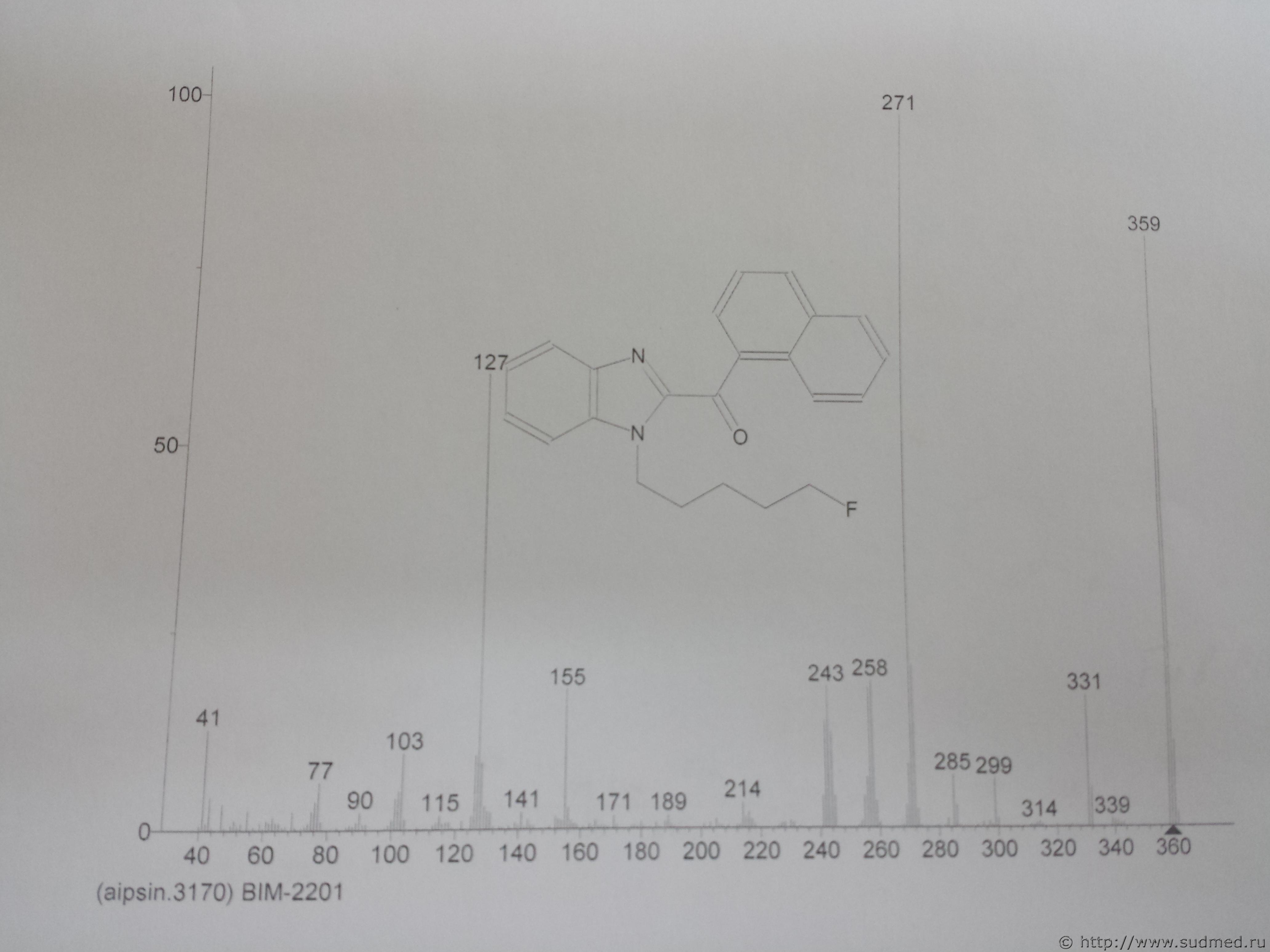 Уважаемые коллеги. По данным УФСКН в нашем регионе ходит некий спайс они называют его BIM-2201. В имеющихся у меня библиотеках я его под таким название не нашел. может есть более распространенное название. есть нативный масс-спектр и формула. Может кто встречал эту бяку? Хотелось бы также узнать какие метаболиты ожидать и каков будет их масс-спектр TMS производных?