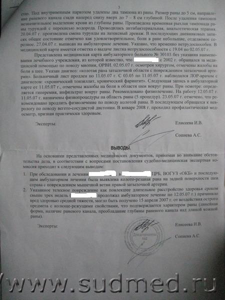 1. Ответ ясен. Однако подчеркиваю, что гражданин N остался жив лишь благодаря своевременно оказанной медицинской помощи (интервал времени от нанесения ножевого ранения до прибытия скорой помощи на место происшествия составил не более 15 мин.), летальный исход был бы неизбежен. Человека спасли, срок неработоспособности составил более 21 дня и именно по сроку нетрудоспособности эксперты определяют степень вреда здоровью, не беря в расчет вред здоровью, опасный для жизни человека. Данное утверждение основывается на медико-правовых критериях определения степени тяжести вреда здоровью, cогласно которым "опасные для жизни повреждения - это повреждения, которые при отсутствии медицинской помощи закономерно заканчиваются смертельным исходом". 2. Возможно в медицинских документах не содержится достаточных сведений, без которых не представляется возможным судить о характере и степени тяжести вреда, причиненного здоровью потерпевшего. Тогда встает вопрос о проведении полноценной и справедливой экспертизы с оценкой всех критериев. Однако каким образом это правомерно сделать, если суд мед экспертиза проводится только по мед. документам? Спасибо. Прикрепленные файлы