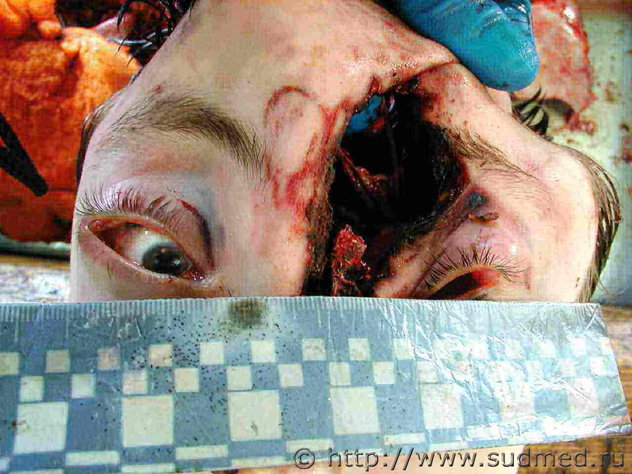Может и не в тему, но точно казуистика. Уже давно, исследовали труп мужчины с разрушениями головы, аналогичными по объему увиденным на фото. Мужчина покончил жизнь самоубийством как в последствии выяснилось достаточно оригинальным способом, положил себе в рот электродетонатор, и замкнул цепь. Итог практически полное разрушение лица,свода черепа с разрушением мозга...