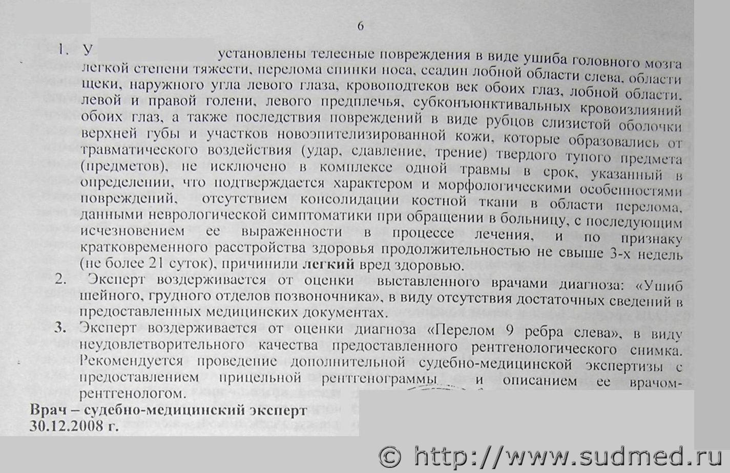 Цитата а как это доказать судмедэксперту?  Это не Вы должны сто-то доказывать судмедэксперту. Это судмедэксперт обязан обосновать свое мнение. Если СМЭ полагает, что легкий ушиб головного мозга вызывает расстройство здоровья на срок не более 3х недель - пусть приведет соответствующие дитературные судебно-медицинские или клинические данные.  |