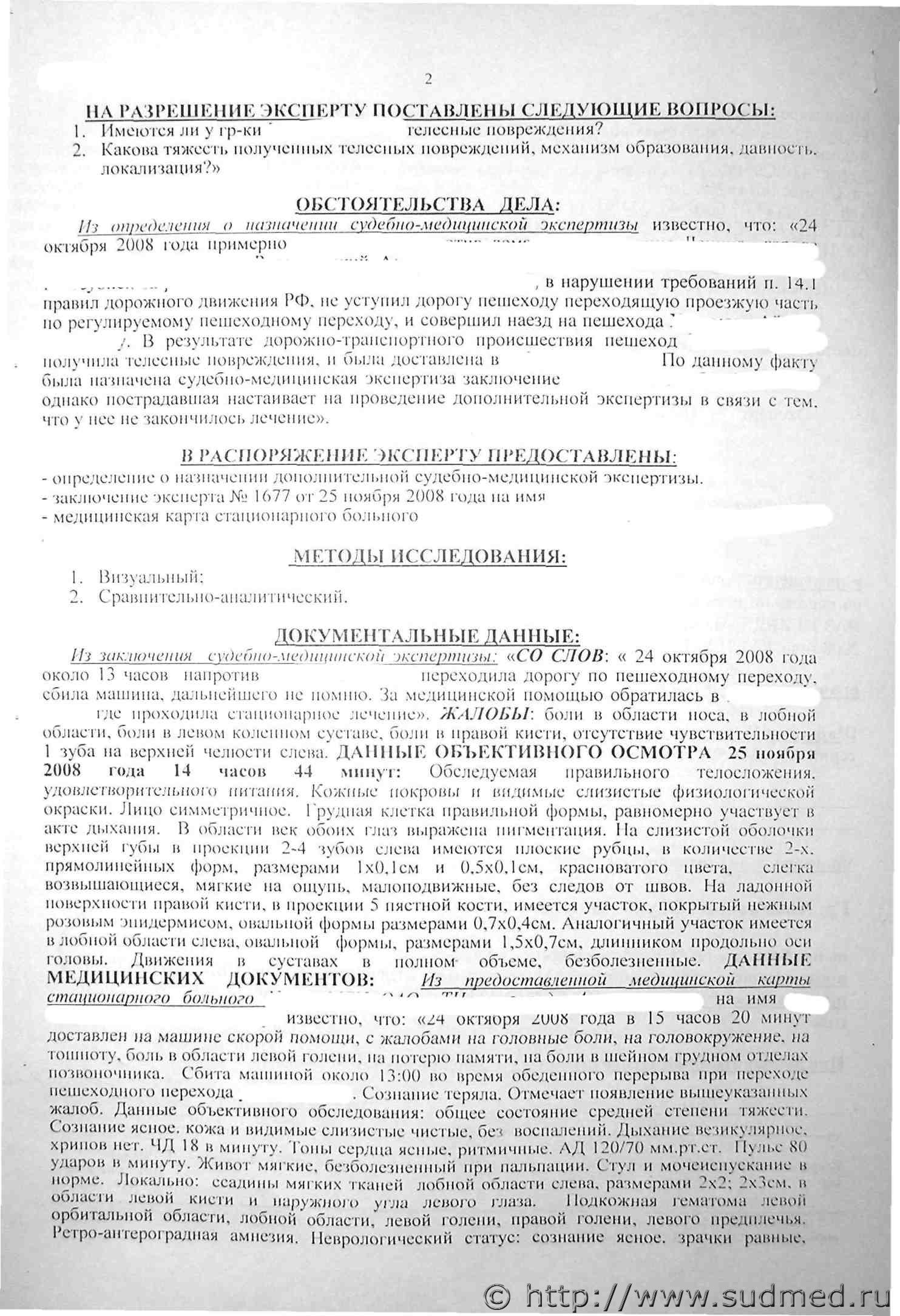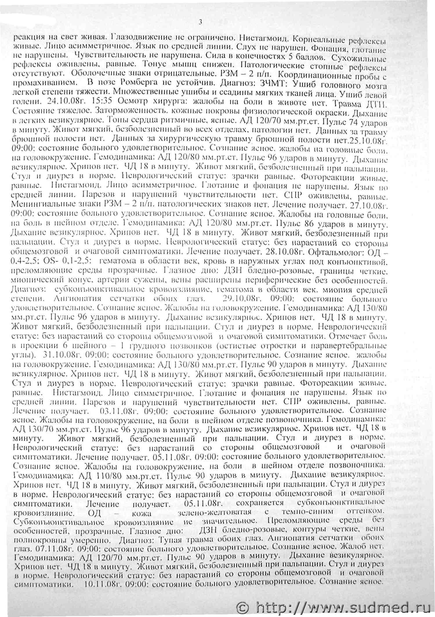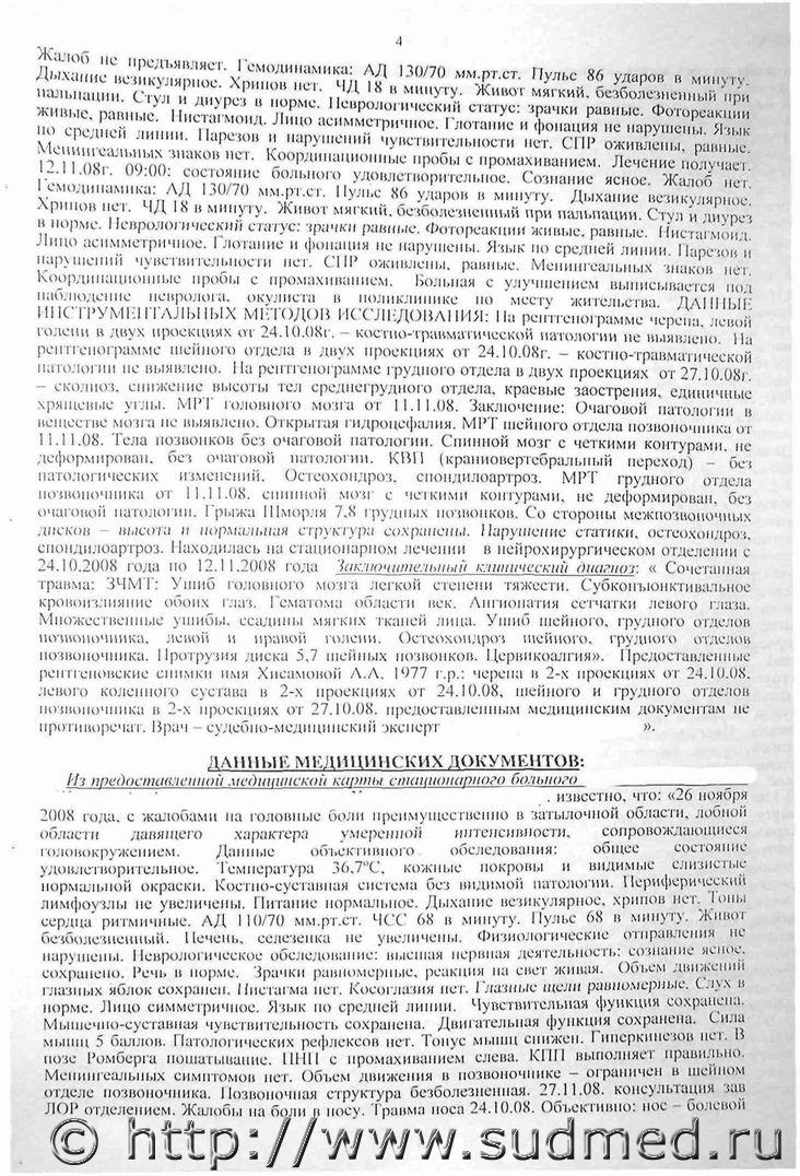 экспертиза 04 4 лист эксп. пока не вижу, если нет то прикреплю чуть позже... 5 синдром, спинки носа носовая перегородка по средней линии. Рентгенограмма костей носа от 20.11.08. перелом костей носа без смещения. Диагноз: закрытый перелом костей носа. 28.11,08г. Жалобы: головные боли сохраняются, преимущественно в височных и затылочных областях, головокружение, плохой сон. 24.10.08г. травма черепа, ушиб головного мозга. Неврологический статус: состояние относительно удовлетворительное. ЧМН: глазные щели равные, парез конвергенция, общая мышечная гипотония. СХР больше справа с рук. с ног равные. 29-30.11.08г. выходные дни. 01.12.08г. жалобы на головные боли, чаще по утрам и лобной области, сопровождаются головокружением, мелькание мушек перед глазами, снижение зрения ... бокового зрения справа. Неврологический статус: состояние стабильное. Сознание ясное, на вопросы отвечает активно. ЧМН без особенностей. СХР с ног низкого фона, равные, с рук слева больше чем справа. В позе Ромберга пошатывание с отшатыванием назад- Координационные пробы выполняет правильно. АД 100/60 мм.рт.ст. Пульс 64 ударов в минуту. ЧДД 16 в минуту. 03.12.08г. жалобы на боли в левом коленном суставе при ходьбе «стартовые боли». Неврологический статус: состояние стабильно, сознание ясное, на вопросы отвечает активно. ЧМН без особенностей. СХР с ног умеренного фона. В позе Ромберга легкое пошатывание. Координационные пробы выполняет правильно. 05.12.08.ортопед. Боли в левом коленном суставе. Сбита автомашиной в октябре. Удар по ноге. При осмотре в суставе коленном небольшое скопление свободной жидкости. Движение в полном объеме. Боль при сгибании. Разгибание умеренное. Боль в проекции внутренних мягких (больше записей нет). На рентгенограмме коленного сустава острой патологии не определено. Диагноз: «Менисцит. сиповит левого коленного сустава». 06-08.12.08г. праздничные дни. 09.12.08г. боли в шейном отделе позвоночника уменьшились, пока охраняются, беспокоят в левом боку. На рентгенограмме грудной клетки — перелом 9-го ребра слева. АД 110/70 мм.рт.ст. 10.12.08г. окончила курс лечения. Интенсивность болевого синдрома меньше. Сохраняются боли по ходу позвоночника, в левом боку. Выписывается домой. Продолжить лечение амбулаторно под наблюдением ВОИ. Нa рентгенограмме левого коленного сустава в двух проекциях от 03.12.08г. - уплотнение эпифиза болыпеберцовой кости, заострены суставные края. Ранние признаки острого артроза левого коленного сустава. На рентгенограмме пяточной области обеих стоп в боковой проекции от 09.12.08г. -контуры пяточных костей четкие, ровные, экзостозов не замечено. На обзорной рентгенограмме левой половины органов грудной клетки в прямой проекции от 10.12.08г. -трещина, перелом 9-го ребра по задне-подмышечной линии с небольшим смещением отломков по ширине. Находилась па стационарном лечении в неврологическом отделении с 26.11.08г. по 10.12.08г. Диагноз заключительный клинический: основной: «Выраженная вертеброгенная торакалгия, цервикалгия. обострение на фоне остеохондроза позвоночника, ушиба трудной клетки ( 10.08). сопутствующий: «Ранний восстановительный период. Закрытая травма черепа (сотрясение мозга 10.2008г.); посттравматическая головная боль, напряжение; астенический синдром, ушиб грудной клетки, перелом 9-го ребра слева». На предоставленных рентгеновских снимках костей носа от 20.11.08. определяется полный перел